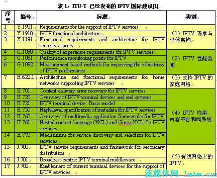 ITU-T已經(jīng)推出的IPTV國際標準涉及需求和架構(gòu)、性能監(jiān)測、家庭網(wǎng)絡(luò)、應(yīng)用平臺與端系統(tǒng)以及有線網(wǎng)上的IPTV等5大領(lǐng)域,是全球范圍內(nèi)IPTV產(chǎn)業(yè)界達成的共識,具有廣泛的產(chǎn)業(yè)基礎(chǔ)。