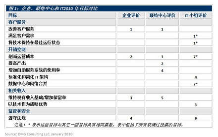 DMG的基準調研顯示IT有自己的優(yōu)先級:IT2010年的首要目標是滿足商業(yè)客戶的需求并使企業(yè)的技術和應用軟件運行在最佳狀態(tài)。這表明IT企業(yè)是帶著強烈的支持企業(yè)客戶目標和目的的意愿步入2010年的。但令人失望的是IT企業(yè)并沒有努力去了解他們客戶的目標。這種目標上的不一致是導致IT和聯(lián)絡中心之間缺乏信任的主要原因。