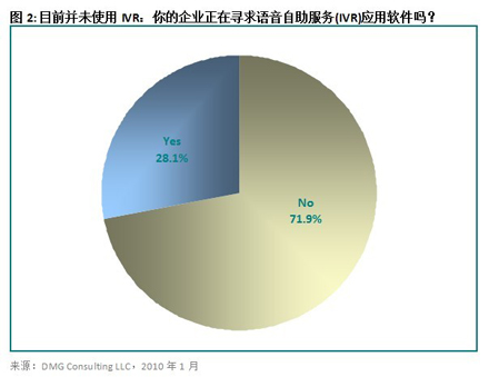 28.1%目前還沒有使用IVR系統(tǒng)的公司正在積極尋求語音自助服務解決方案來幫助自己達成目標,這一數(shù)字高得頗讓人驚訝。見圖2。經濟衰退促使那些曾經對使用自助服務技術猶豫不決的企業(yè)下定決心投資購買此類解決方案。一個具有正確規(guī)劃、設計和投放過程的IVR系統(tǒng)能夠將人工代理處理的電話量降低20%到90% (長期來說),具體數(shù)字有賴于聯(lián)絡中心的目的以及編入解決方案內部的任務。IVR用戶的增長勢頭有望在經濟形勢好轉之后仍然延續(xù)下去。一個經過良好設計并成功實施的IVR方案所帶來的利益和節(jié)約的成本是即便最不情愿使用它的經理都不得不承認的。