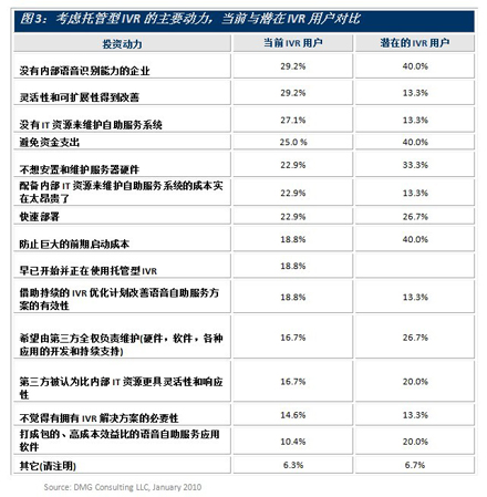圖3顯示了現(xiàn)有和潛在的語音自助服務用戶尋求托管型IVR的主要動力來源。潛在客戶認真考慮托管型IVR解決方案的兩個很明顯的原因是避免大的資金開銷和最小化啟動成本,在經濟不景氣時這樣的做法并不令人意外。另外還有個原因是希望一邊使用該方案一邊積累經驗和知識。