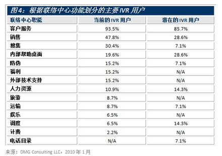 圖4根據(jù)職能對現(xiàn)有和潛在的主要IVR用戶進行了區(qū)分。客戶服務和銷售聯(lián)絡中心是最上層的IVR用戶,分別占現(xiàn)有用戶量的93.5%和47.8%,占潛在用戶量的85.7%和28.6%。