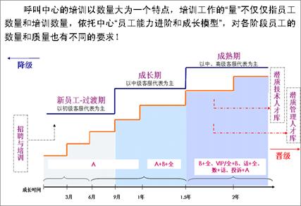 業(yè)務(wù)模塊化后,客服中心對(duì)一線客服代表進(jìn)行分級(jí)認(rèn)證,針對(duì)簡單業(yè)務(wù)和復(fù)雜業(yè)務(wù)分別設(shè)置首層和二線專席兩類共計(jì)8種人員承接梯隊(duì),達(dá)到業(yè)務(wù)與人員的全匹配。人員梯隊(duì)的設(shè)置對(duì)人員的培訓(xùn)管理和進(jìn)出機(jī)制提出了新的挑戰(zhàn),如何科學(xué)界定不同隊(duì)列人員的技能標(biāo)準(zhǔn)?如何設(shè)置不同成長時(shí)期員工的進(jìn)出管理機(jī)制?