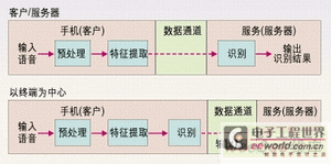 3G手機的ASR應(yīng)用設(shè)計可分為兩類,即以終端為中心和以客戶/服務(wù)器為中心的應(yīng)用。如圖1所示為以終端為中心的設(shè)計方法,3G手機(終端)執(zhí)行整個語音識別過程并送出識別結(jié)果。在圖2所示的客戶/服務(wù)器方法中,終端只是執(zhí)行預(yù)處理特征提取,然后通過一個誤碼受保護的數(shù)據(jù)信道將這些參數(shù)發(fā)送給中心服務(wù)器,中心服務(wù)器最終完成語音識別。如果采用以客戶/服務(wù)器為中心的設(shè)計方法,3G手機應(yīng)使用數(shù)據(jù)信道而非移動信道來將語音發(fā)送給服務(wù)器進行識別,因為移動信道所用的低速率語音編碼會嚴(yán)重影響語音識別的性能。