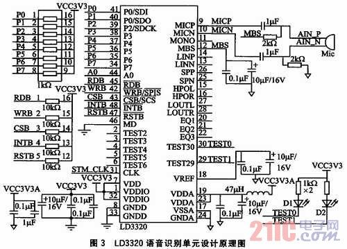 圖3為語音識別部分原理圖,參照了ICRoute發(fā)布的LD3320數(shù)據(jù)手冊進行設(shè)計。LD3320的內(nèi)部集成了快速穩(wěn)定的優(yōu)化算法,不需外接Fla-sh、RAM,不需要用戶事先訓(xùn)練和錄音而完成非特定人語音識別,識別準確率高。