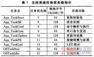 表1中除OSTaskStat和OSTaskIdle任務(wù)為系統(tǒng)自帶,其他7個任務(wù)均為用戶創(chuàng)建。App_TaskStart是系統(tǒng)的第一個任務(wù),對系統(tǒng)時鐘和底層設(shè)備進行初始化,創(chuàng)建所有事件和其他各項用戶任務(wù),并對系統(tǒng)狀態(tài)進行監(jiān)測;App_TaskSR完成語音識別;App_TaskCmd完成對話集中命令的解析和執(zhí)行,并通過USART1向外發(fā)送;App_TaskCom作為外圍擴展任務(wù),通過USART2向外發(fā)送指令或數(shù)據(jù),負責(zé)控制外圍擴展設(shè)備,如語音合成設(shè)備等;