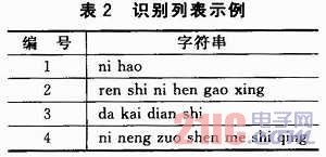 、趯懭胱R別列表。列表的規(guī)則是,每個識別條目對應(yīng)一個特定的編號(1個字節(jié)),編號可以相同,可以不連續(xù),但是數(shù)值要小于256(00H~FFH)。本芯片最多支持50個識別條目,每個識別條目是標(biāo)準普通話的漢語拼音(小寫),每2個字(漢語拼音)之間用一個空格間隔。本文中采取了連續(xù)不同編號的識別條目,表2是簡單的示例。