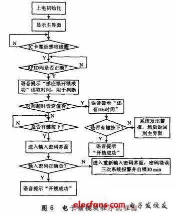 如圖2所示,電子鎖原始密碼和用戶設(shè)定密碼已存于外部存儲器E2PROM內(nèi),用戶要開門需先用電子感應(yīng)鑰匙開RFID碼感應(yīng)鎖,當(dāng)感應(yīng)鎖成功開鎖時,系統(tǒng)將發(fā)出語音提示“感應(yīng)鎖開鎖成功”,然后輸入先前設(shè)定的密碼,密碼正確后,系統(tǒng)發(fā)出語音提示“開鎖成功”,否則提示“輸入密碼錯誤”。輸入密碼三次以上錯誤,系統(tǒng)將報警并自鎖30 min。整個開鎖時間不能超過30 s,否則系統(tǒng)發(fā)出警報聲,以防止盜賊在短時間內(nèi)利用萬能工具開鎖。系統(tǒng)待機時能在液晶上顯示時間、日期和星期等信息,實現(xiàn)友好的人機界面。