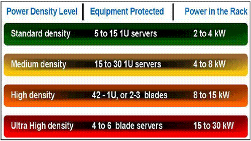 當(dāng)企業(yè)部署刀片式服務(wù)器來宿主其虛擬服務(wù)器時(shí)尤其如此。刀片式服務(wù)器采用多個(gè)即插即用型處理裝置,它們共享公共的電氣系統(tǒng)、電源、風(fēng)扇、電纜和存儲(chǔ)器。這樣的安排節(jié)省了數(shù)據(jù)中心的占地面積,簡化了硬件管理,并提高了IT靈活性。然而,這同時(shí)也大大增加了運(yùn)算密度。結(jié)果,刀片式服務(wù)器產(chǎn)生大量的熱,從根本提高了機(jī)柜級(jí)供電要求。確實(shí),一個(gè)典型的傳統(tǒng)服務(wù)器機(jī)柜可能需要4至6 kW電力,而一個(gè)典型的布滿刀片式機(jī)架的機(jī)柜則可能需要高達(dá)30 kW的電力,遠(yuǎn)遠(yuǎn)超過許多電源和冷卻系統(tǒng)的處理能力。