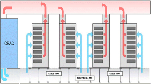 追求更低前期成本和更高運(yùn)行效率的公司可以安裝被動(dòng)式冷卻系統(tǒng)。它們的機(jī)殼上裝有一個(gè)氣密的后門和煙囪,用于收集來自服務(wù)氣的熱排風(fēng),并將其直接引導(dǎo)至CRAC裝置上的回風(fēng)管道中。然后,CRAC裝置對(duì)排風(fēng)進(jìn)行冷卻并重新循環(huán)。被動(dòng)式系統(tǒng)要求機(jī)柜從前到后都具有較強(qiáng)的氣密性,以便與由CRAC裝置進(jìn)入的冷風(fēng)混合的服務(wù)器熱風(fēng)盡量少。通過比普通的熱-冷通道技術(shù)更徹底地分離冷風(fēng)和熱風(fēng),設(shè)計(jì)合理的被動(dòng)式冷卻系統(tǒng)甚至能以低成本使灼熱的30kW服務(wù)器機(jī)柜在安全溫度下運(yùn)行。