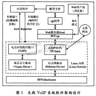 系統(tǒng)軟件設(shè)計(jì)的整體架構(gòu)如圖5所示,其在無(wú)線局域網(wǎng)內(nèi)實(shí)現(xiàn)了基于ADM5120的UDP方式點(diǎn)對(duì)點(diǎn)通訊和廣播通訊。UDP(User Datagram Protocol,用戶數(shù)據(jù)報(bào)協(xié)議)主要用來(lái)支持那些需要在計(jì)算機(jī)之間傳輸數(shù)據(jù)的網(wǎng)絡(luò)應(yīng)用。眾多的客戶/服務(wù)器模式的網(wǎng)絡(luò)應(yīng)用例如網(wǎng)絡(luò)視頻會(huì)議系統(tǒng)等都需要使用UDP協(xié)議。UDP協(xié)議直接位于IP(網(wǎng)際協(xié)議)協(xié)議的頂層,屬于網(wǎng)絡(luò)協(xié)議中的傳輸層協(xié)議。由于UDP協(xié)議不需建立連接,具有效率高、速度快和占用資源少等優(yōu)點(diǎn),應(yīng)用于消息通信和實(shí)時(shí)系統(tǒng)中可以提高系統(tǒng)傳輸數(shù)據(jù)的效率。UDP具有組播和廣播功能,是分發(fā)信息的一個(gè)理想?yún)f(xié)議。本系統(tǒng)還移植了一種基于ADM5120的嵌入式Web服務(wù)器boa,實(shí)現(xiàn)了對(duì)VoIP系統(tǒng)進(jìn)行基于B/S方式的Web配置。
