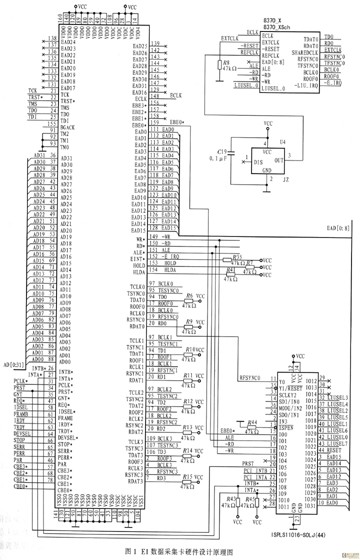 隨著電信網(wǎng)絡(luò)迅速發(fā)展,基于軟交換技術(shù)的NGN網(wǎng)絡(luò)應(yīng)運(yùn)而生。在構(gòu)建中,NGN需通過信令網(wǎng)關(guān)SG與現(xiàn)有的七號(hào)信令網(wǎng)互通,但在物理上采用HDLC格式的 E1傳輸。為了維護(hù)NGN網(wǎng)絡(luò),實(shí)現(xiàn)不同采集口的多協(xié)議關(guān)聯(lián)、呼叫的合成等功能,相應(yīng)的測試儀表必須提供網(wǎng)卡和E1卡的測試接口。根據(jù)NGN網(wǎng)絡(luò)測試儀表的總體設(shè)計(jì)方案要求,數(shù)據(jù)采集卡采用PCI插槽,E1信號(hào)經(jīng)物理接口器件成幀,通過串口送給MUSYCC,完成消息重組,最后通過PCI總線將消息送至上層軟件進(jìn)行協(xié)議分析處理。數(shù)據(jù)采集卡提供網(wǎng)絡(luò)接口的物理層、鏈路層功能以及PCI規(guī)范接口,可同時(shí)監(jiān)測8路E1信號(hào)。