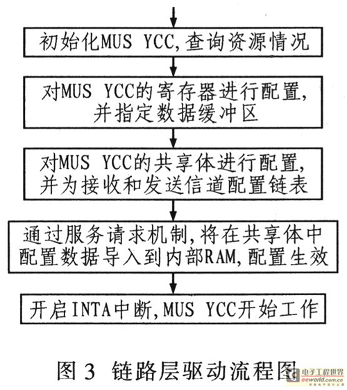 鏈路層HDLC控制器主要完成內(nèi)部寄存器和映射的共享體配置。共享體用于HDLC寄存器的初配、接收和發(fā)送緩沖區(qū)以及時(shí)隙映射表的配置。HDLC控制器為每個(gè)信道都建立一個(gè)消息鏈表,這樣數(shù)據(jù)緩沖區(qū)可以循環(huán)利用。HDLC控制器與成幀器的對應(yīng)關(guān)系決定于HDLC控制器端口映射方式的設(shè)置。其配置流程如圖3所示。