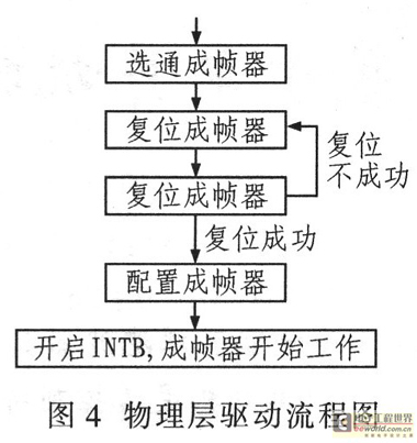 物理層通過地址總線映射配置成幀器,其中PCI橋設(shè)備和成幀器之間經(jīng)過CPLD控制選通。物理層驅(qū)動(dòng)完成配置成幀器、復(fù)位控制等。成幀器是將E1上的比特流整合成符合規(guī)范的HDLC幀,其中一個(gè)標(biāo)準(zhǔn)HDLC幀包括32個(gè)時(shí)隙,這些時(shí)隙可配置映射到HDLC控制器的端口信道,實(shí)現(xiàn)2 M、N×64 K、N×8 K高速模式。其配置流程如圖4所示。