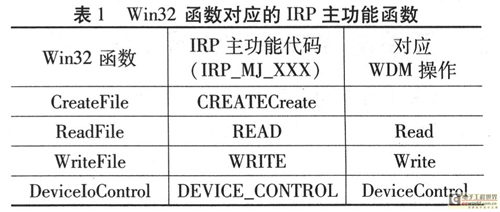 在Windows中,應(yīng)用程序與WDM通信的實(shí)現(xiàn)過程:應(yīng)用程序應(yīng)先獲得設(shè)備句柄GUID碼,然后利用CreateFile函數(shù)打開設(shè)備,通過 DeviceIoControl函數(shù)傳遞控制代碼參數(shù)和WDM進(jìn)行通信,包括從WDM中讀取數(shù)據(jù)和寫數(shù)據(jù)給WDM兩種情況,也可利用ReadFile從 WDM中讀取數(shù)據(jù)或用WriteFile寫數(shù)據(jù)給WDM:當(dāng)下層驅(qū)動(dòng)有觸發(fā)事件時(shí),就需要Event事件通知上層軟件。當(dāng)應(yīng)用程序退出時(shí),CloseHandle則關(guān)閉設(shè)備,這將產(chǎn)生對應(yīng)于此設(shè)備對象的相應(yīng)IRP消息。這種關(guān)系如表1所列。