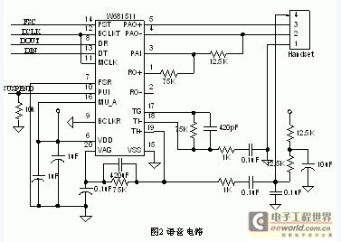 IP電話的原理圖如圖1所示。它由Tiger560B和W681511及其外圍設(shè)備和接口組成。主要電路有:語(yǔ)音電路、LCD顯示電路、鍵盤電路。