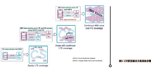 讓我們來看看主流運(yùn)營(yíng)商在LTE時(shí)代有哪些語(yǔ)音解決方案可以挑選,以及它們的優(yōu)劣比較(見表1)。圖3為實(shí)現(xiàn)LTE語(yǔ)音解決方案的具體步驟。