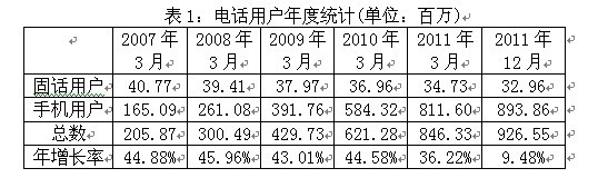 政府對電信市場的開放不僅帶來了電信產(chǎn)業(yè)的快速發(fā)展,激烈的競爭也令消費(fèi)者享受到性價比更高的服務(wù)。近幾年,電話用戶總數(shù)持續(xù)增長,從1999年的2281萬增加到2011年3月底的8億4633萬。截至2011年12月31日,電話用戶總數(shù)達(dá)到9億2655萬,說明從2011年4-12月期間新增用戶8022萬。其中,手機(jī)用戶數(shù)增長最為顯著,從2007年的1億6509萬增加到2011年3月的8億1160萬,2011年12月底達(dá)到8億9386萬。但是,固話用戶的數(shù)量則從2007年的4077萬減少到2011年3月的3473萬,到2011年12月僅有3269萬。(見表1)