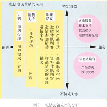 ——圖2表示以電話營銷的目的及對象為軸分析電話營銷的應用?v軸為對象,分為“特定”和“不特定”,橫軸為目的,分為“服務”和“銷售”。這樣右上區(qū)域=“特定對象X服務”,即為客戶服務,右下區(qū)域=“不特定對象X服務”,對應信息咨詢;左側為銷售。從對象來看,服務更偏重于“特定對象”。從目的來看,訂購/預約受理是最直接的銷售行為,所以放在最左,銷售支持在中間,促銷活動靠右。