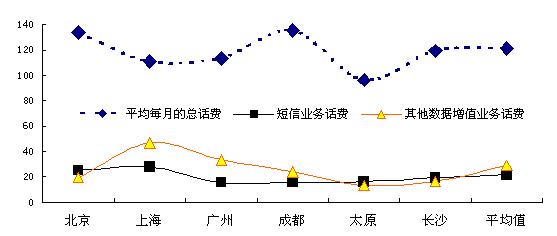 調(diào)查數(shù)據(jù)顯示,在所訪6個城市的手機(jī)用戶中,過去三個月平均每個月的話費總額平均為121.3元(以北京和成都的用戶平均總話費較高),其中短信話費平均每月為14.0元,而其它數(shù)據(jù)增值業(yè)務(wù)話費平均話費為4.8元。
