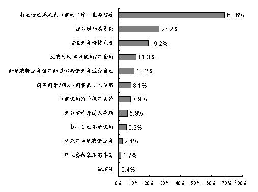 調(diào)查發(fā)現(xiàn),目前制約手機(jī)用戶使用更多數(shù)據(jù)增值業(yè)務(wù)的原因主要是:“打電話已經(jīng)滿足目前的工作/生活需要”(占68.6%)、“擔(dān)心增加消費額”(占26.2%)、“增值業(yè)務(wù)價格太貴” (占19.2%)、“沒有時間學(xué)習(xí)使用/不會用”(占11.3%)、“知道有新業(yè)務(wù)但不知道哪些新業(yè)務(wù)適合自己”(占10.2%)等。
