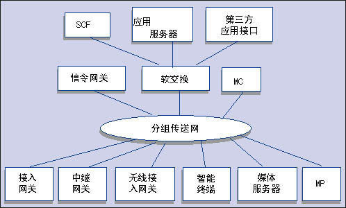 接入層包括各種接入網(wǎng)關(guān)、中繼網(wǎng)關(guān)、無(wú)線接入網(wǎng)關(guān)、智能終端以及與處理媒體有關(guān)的媒體服務(wù)器和多點(diǎn)處理器(MP)。傳送層包括提供IP包轉(zhuǎn)發(fā)的各種承載網(wǎng)功能實(shí)體。控制層是NGN網(wǎng)絡(luò)的核心,主要包括軟交換設(shè)備、信令網(wǎng)關(guān)和多點(diǎn)處理器。業(yè)務(wù)層則主要包括應(yīng)用服務(wù)器、第三方應(yīng)用接口和傳統(tǒng)智能網(wǎng)功能。該業(yè)務(wù)層通過(guò)開放的業(yè)務(wù)層接口向用戶提供傳統(tǒng)智能網(wǎng)業(yè)務(wù)、多樣化的第三方業(yè)務(wù)和增值業(yè)務(wù)。