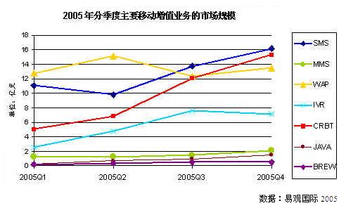 2005年分季度主要移動增值業(yè)務的市場規(guī)模圖