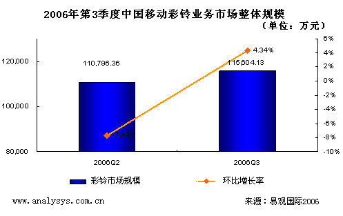 研究表明,2006年第3季度,CRBT業(yè)務(wù)略有反彈。其中移動彩鈴業(yè)務(wù)的分帳前信息費(fèi)接近16000萬元,較上個季度小幅度反彈2.6%。但是總體上仍然呈現(xiàn)徘徊態(tài)勢,并沒有走出低級飽和區(qū)。易觀網(wǎng)