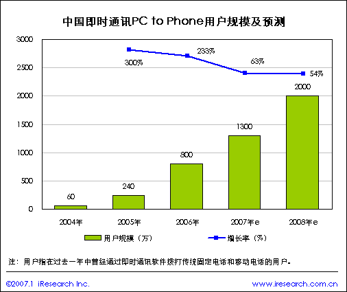 2004年10月以前中國(guó)使用PC to Phone的VOIP用戶非常少,且主要是使用國(guó)外運(yùn)營(yíng)商提供的服務(wù),像Skype、TELTEL和dialpad等。隨著Skype登錄中國(guó),一些國(guó)內(nèi)公司聯(lián)合地方的電信運(yùn)營(yíng)商以“增值服務(wù)”的形式推出具有PC to Phone功能的即時(shí)通訊軟件。艾瑞市場(chǎng)咨詢