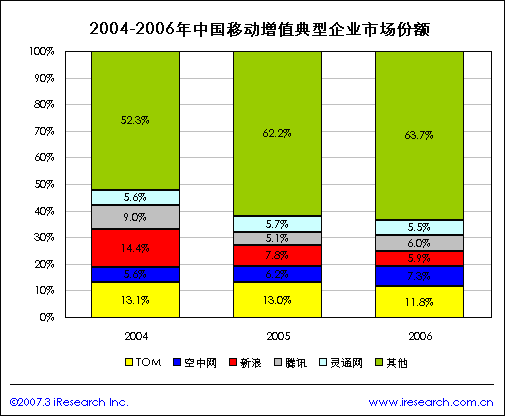 iResearch艾瑞市場咨詢最新的研究成果顯示,2004-2006年,在中國的移動增值市場中,TOM、新浪的市場份額處于不斷下降的趨勢,其中下降最明顯的是新浪網(wǎng),它的市場份額已由2004年的14.4%下降到2006年的5.9%,但與此同時空中網(wǎng)的市場份額卻處于增長趨勢,已由2004年的5.6%增長到2006年的7.3%.艾瑞市場咨詢(iresearch)