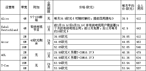 在純上網(wǎng)服務(wù)方面,德國Alice公司的4Mbps寬帶最為廉價(jià),包月30歐元,德國人一般月工資大約是1500~2500歐元,上網(wǎng)費(fèi)占低于純收入的2%。
