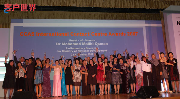 2007年11月23日,新加坡。2007年度國際呼叫中心大獎頒獎典禮今天在新加坡Ritz Carlton酒店隆重舉行;繼2006年首度接軌亞太地區(qū)最佳呼叫中心評選活動之后,中國呼叫中心行業(yè)協(xié)會CNCCA再次組團(tuán)出訪獅城新加坡。在本年度國際最佳呼叫中心評選的角逐當(dāng)中,來自中國的中國電信深圳分公司10000號客戶服務(wù)中心、中國移動通信集團(tuán)廣東有限公司客戶服務(wù)(廣州)中心、中國工商銀行電子銀行中心攜手榮膺最佳呼叫中心大獎。客戶世界