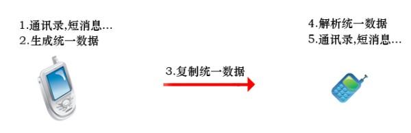 對于新出的手機(jī)型號,如果可以通過手機(jī)直接生成統(tǒng)一格式的交換數(shù)據(jù),并且可以通過手機(jī)直接解析其他手機(jī)生成交換數(shù)據(jù),示意圖如下: