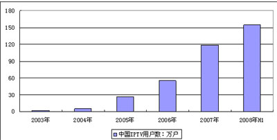 圖 1 2003-2008年上半年中國IPTV用戶數