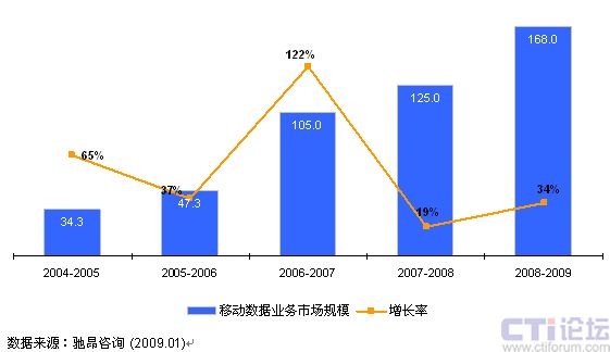 CTI論壇(ctiforum)04月22日消息: 馳昂咨詢(xún)(Sinotes)發(fā)布的《2008~2009年中國(guó)移動(dòng)數(shù)據(jù)業(yè)務(wù)發(fā)展報(bào)告》數(shù)據(jù)顯示,2008年,中國(guó)移動(dòng)數(shù)據(jù)業(yè)務(wù)市場(chǎng)規(guī)模為168億美元,相比2007年,同比增長(zhǎng)34%。雖然全球金融危機(jī)使得電信行業(yè)也略受影響,但是并沒(méi)有阻礙移動(dòng)數(shù)據(jù)業(yè)務(wù)的發(fā)展。中國(guó)移動(dòng)數(shù)據(jù)業(yè)務(wù)市場(chǎng)保持了較快的速度發(fā)展。2008年,3G牌照發(fā)放、奧運(yùn)會(huì)等諸多事件都是促進(jìn)移動(dòng)數(shù)據(jù)業(yè)務(wù)發(fā)展的重要因素。CTI論壇報(bào)道