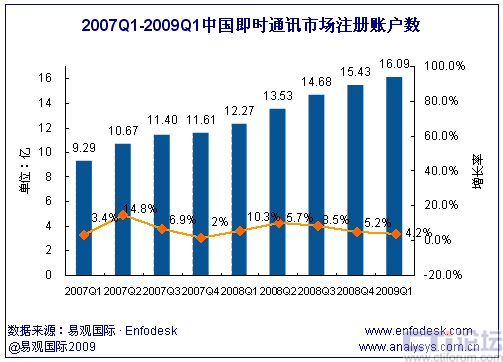 2009年第1季度中國即時(shí)通訊市場(chǎng)累計(jì)注冊(cè)賬戶數(shù)達(dá)16.1億