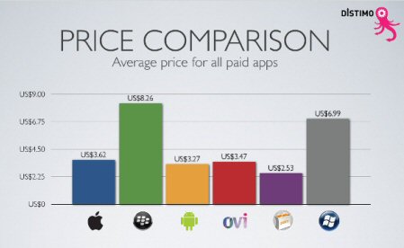 Mobile的應(yīng)用平均售價(jià)也較高,為6.99美元,諾基亞Ovi為3.47美元,Palm僅為2.53美元。