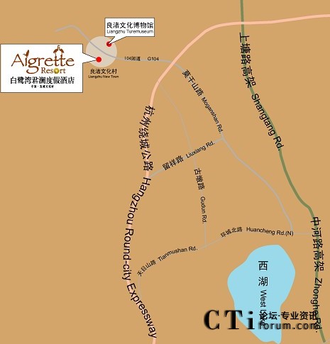 杭州城站火車(chē)站——西湖大道(入口)——中和路高架(出口)——勾運(yùn)路——莫干山路(過(guò)勾莊收費(fèi)站)——新104國(guó)道(大陸出口)——良渚文化村——杭州白鷺灣君瀾度假酒店