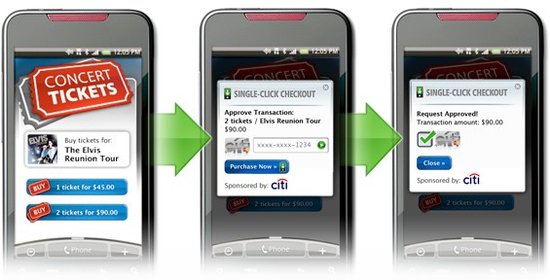 北京時(shí)間11月10日消息,據(jù)國(guó)外媒體報(bào)道,花旗銀行支持的Single-Click Checkout(singleclickcheckout.com)服務(wù)今天在舊金山的開放移動(dòng)峰會(huì)(Open Mobile Summit)上推出,它是第一個(gè)為Android設(shè)計(jì)的信用卡結(jié)帳應(yīng)用程序。使用這項(xiàng)新服務(wù),商家可以接受來自任何移動(dòng)用戶的信用卡付款。