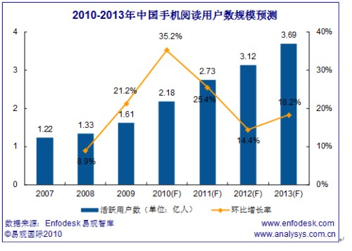 易觀國(guó)際(Analysys International)分析預(yù)計(jì)2010年手機(jī)閱讀市場(chǎng)規(guī)模將突破30億元。