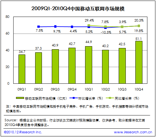 根據(jù)艾瑞咨詢即將發(fā)布的2010年第四季度中國移動(dòng)互聯(lián)網(wǎng)市場(chǎng)監(jiān)測(cè)數(shù)據(jù)顯示,2010Q4中國移動(dòng)互聯(lián)網(wǎng)市場(chǎng)整體規(guī)模達(dá)到51.1億,同比增長(zhǎng)19.8%,環(huán)比增長(zhǎng)20.3%。艾瑞咨詢分析認(rèn)為,本季度電信運(yùn)營商對(duì)計(jì)費(fèi)通道治理開始收尾,移動(dòng)增值市場(chǎng)整體復(fù)蘇。同時(shí)手機(jī)電子商務(wù)、手機(jī)游戲業(yè)務(wù)領(lǐng)域取得良好市場(chǎng)表現(xiàn),受手機(jī)應(yīng)用商店、位置簽到服務(wù)等新型手機(jī)業(yè)務(wù)創(chuàng)新的帶動(dòng),移動(dòng)互聯(lián)網(wǎng)規(guī)模總體攀升,投融資比重增加。艾瑞咨詢