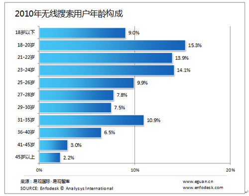 據(jù)Enfodesk易觀智庫近期發(fā)布的研究表明:中國無線搜索市場(chǎng)用戶結(jié)構(gòu)在2010年已經(jīng)發(fā)生巨大變化。對(duì)比2009年數(shù)據(jù)來看,無線搜素用戶在性別、年齡、職業(yè)分布方面,已經(jīng)發(fā)生快速的變化。