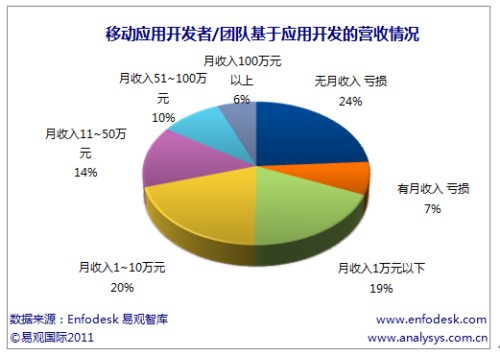 CTI論壇(ctiforum)3月11日消息(記者:張潔)新興移動互聯(lián)網(wǎng)終端的快速發(fā)展以及終端廠商“終端+應(yīng)用商店”的商業(yè)模式帶動了上游應(yīng)用開發(fā)者的投入力度。據(jù)易觀國際(Analysys International)最新報告《中國應(yīng)用開發(fā)者/團(tuán)隊研究報告2011》研究發(fā)現(xiàn),現(xiàn)階段應(yīng)用開發(fā)者主要開發(fā)免費應(yīng)用,整體盈利不夠明顯。