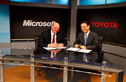 4月初簽署合作協(xié)議的豐田汽車(chē)總裁豐田章男(右)與微軟CEO鮑爾默