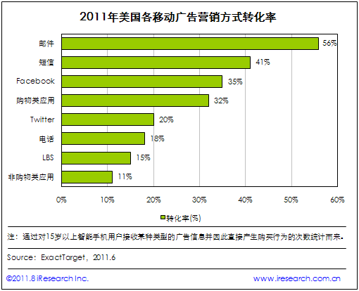 iResearch艾瑞咨詢整理ExactTarget調(diào)研數(shù)據(jù)時(shí)發(fā)現(xiàn):2011年在驅(qū)動(dòng)美國(guó)手機(jī)用戶產(chǎn)生購(gòu)買的移動(dòng)廣告營(yíng)銷方式中,電子郵件營(yíng)銷的轉(zhuǎn)化率最高,達(dá)到56%,短信、Facebook、購(gòu)物類手機(jī)應(yīng)用(如Amazon、eBay、Groupon)以41%、35%、32%的轉(zhuǎn)化率依次位居二、三、四位。艾瑞咨詢