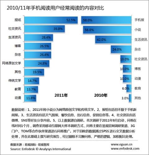 據(jù)易觀國際(Analysys International)最新報(bào)告《2011年中國手機(jī)閱讀市場用戶研究報(bào)告》(以下簡稱《報(bào)告》)研究發(fā)現(xiàn),報(bào)紙、生活資訊、社交資訊等類微內(nèi)容超越文學(xué)作品等長內(nèi)容成為手機(jī)閱讀用戶的習(xí)慣性閱讀內(nèi)容。