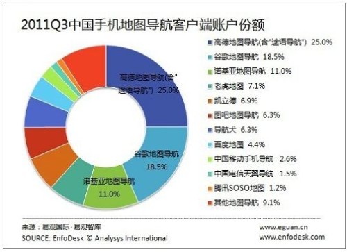 據(jù)ABI最新統(tǒng)計(jì),安卓在亞太區(qū)智能手機(jī)市場(chǎng)的份額,已經(jīng)從2010年的16%,飚升到2011年的52%;智能手機(jī)占亞太地區(qū)整體手機(jī)市場(chǎng)的份額,也從17%,提升到24%以上。受益于智能終端普及率的持續(xù)攀升,第3季度,中國手機(jī)地圖客戶端和手機(jī)導(dǎo)航客戶端的市場(chǎng)環(huán)比增長率分別達(dá)到33.7%和23.5%。