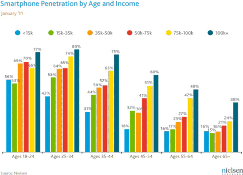 北京時間2月20日晚間消息,調(diào)研公司尼爾森今日發(fā)布的一項調(diào)查報告顯示,今年1月美國智能手機普及率為48%,推動智能手機普及的兩大因素是年齡和收入。新浪科技