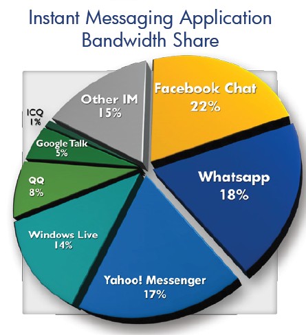 WhatsApp,跨平臺(tái)移動(dòng)信息app發(fā)展很快,從2011年上半年的不到3%增長至11%。Yahoo信使,曾是近些年的主流即時(shí)通信應(yīng)用,下降明顯,從29%將至17%。QQ則有8%的流量份額。