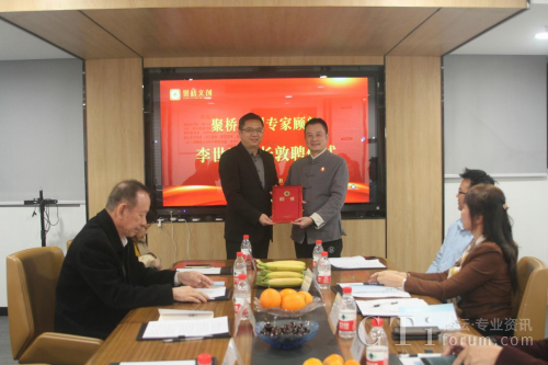 (圖:聚橋文創(chuàng)總經理鄒橋華向廣東省傳統(tǒng)文化促進會會長李世玉頒發(fā)顧問聘書)