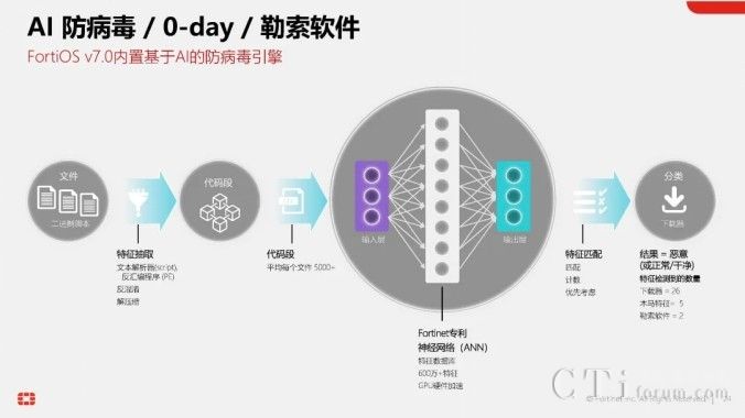 目前,AI技術(shù)已深度融入Fortinet的數(shù)十種產(chǎn)品與方案中。在最新版的統(tǒng)一網(wǎng)絡(luò)安全操作系統(tǒng)FortiOS 7.6中,就已經(jīng)內(nèi)置了由FortiGuard AI實(shí)驗(yàn)室研發(fā)的基于AI的防病毒引擎。該引擎運(yùn)用神經(jīng)網(wǎng)絡(luò)技術(shù),學(xué)習(xí)并區(qū)分海量病毒文件與正常文件,通過分類打分的方式,實(shí)現(xiàn)對未知文件與病毒的精準(zhǔn)判斷,無需依賴傳統(tǒng)的病毒特征庫。因此,F(xiàn)ortinet的FortiGate等產(chǎn)品在防病毒方面擁有雙引擎加持,既有傳統(tǒng)的基于病毒特征庫的防病毒引擎,又有基于AI的下一代防病毒引擎(Anti-virus NGAV),雙重保障,安全無憂。